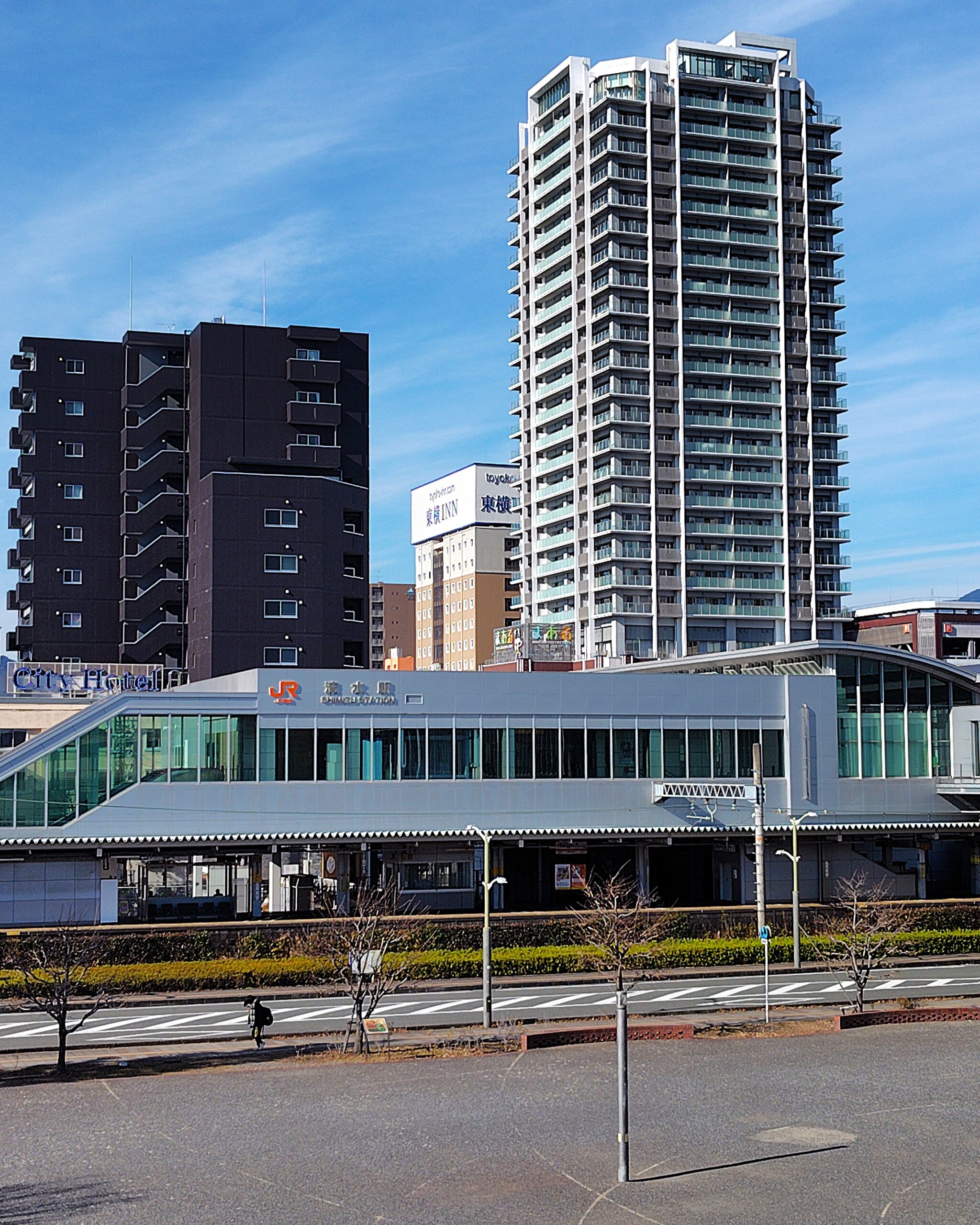 駅前には東横INN静岡清水駅前店がございます🏨手前のビルに隠れて少し見えにくいですが、清水駅西口から歩いてすぐの好立地!静岡市清水区へお越しの際は是非ご利用くださいませ👍