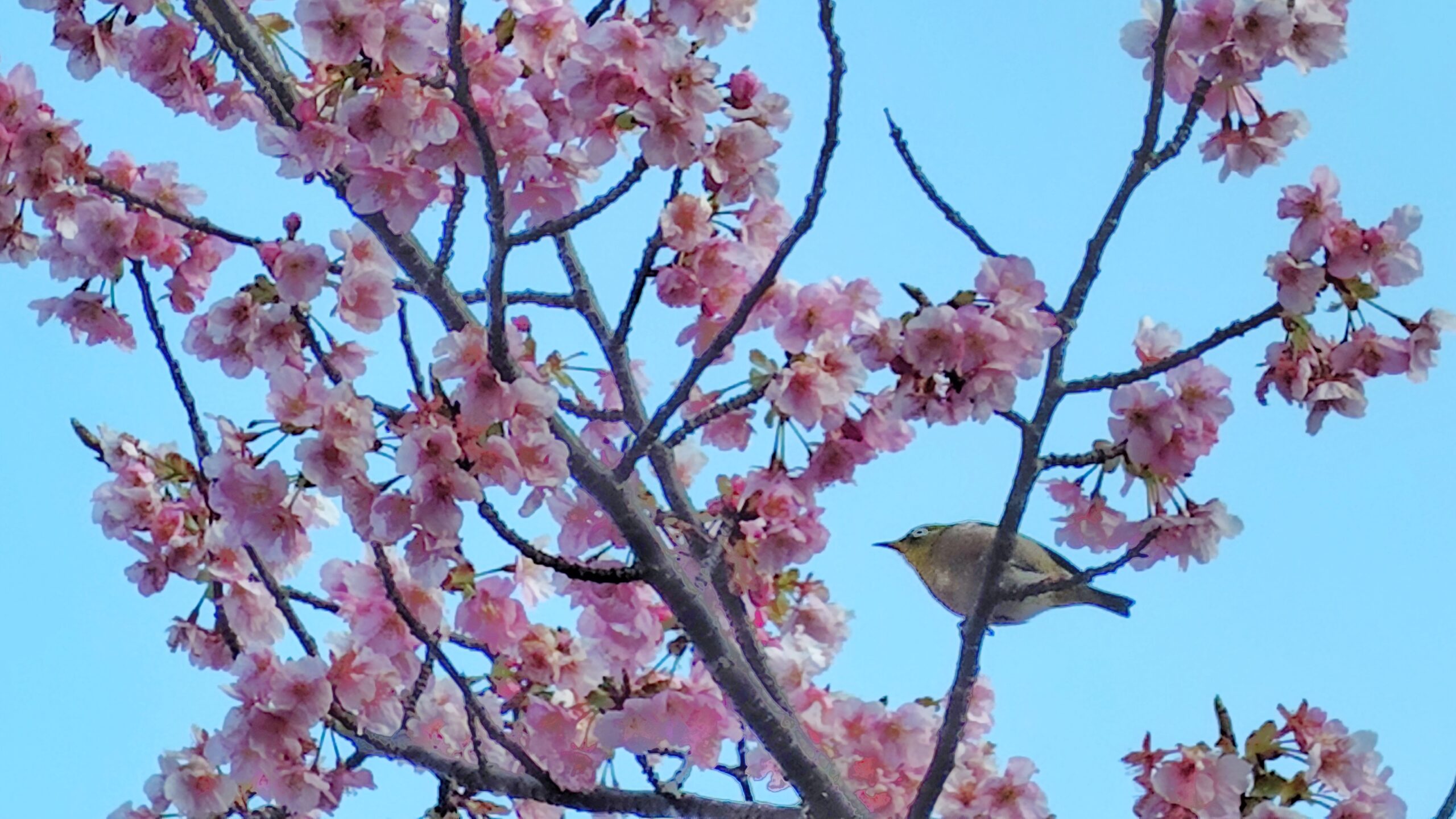 樹上ではメジロが桜をついばんで蜜を吸っており、なんとも春らしい雰囲気です❤