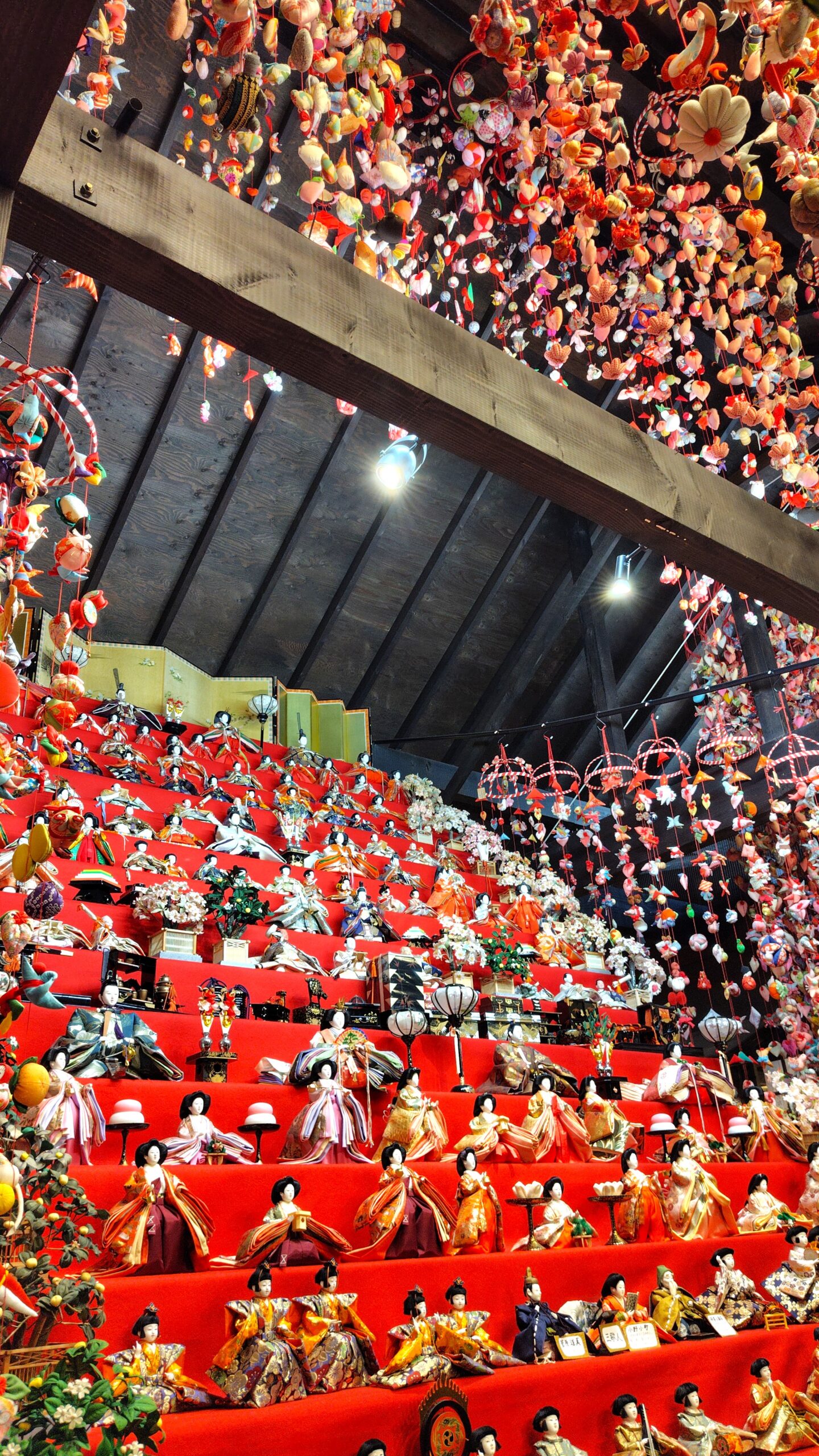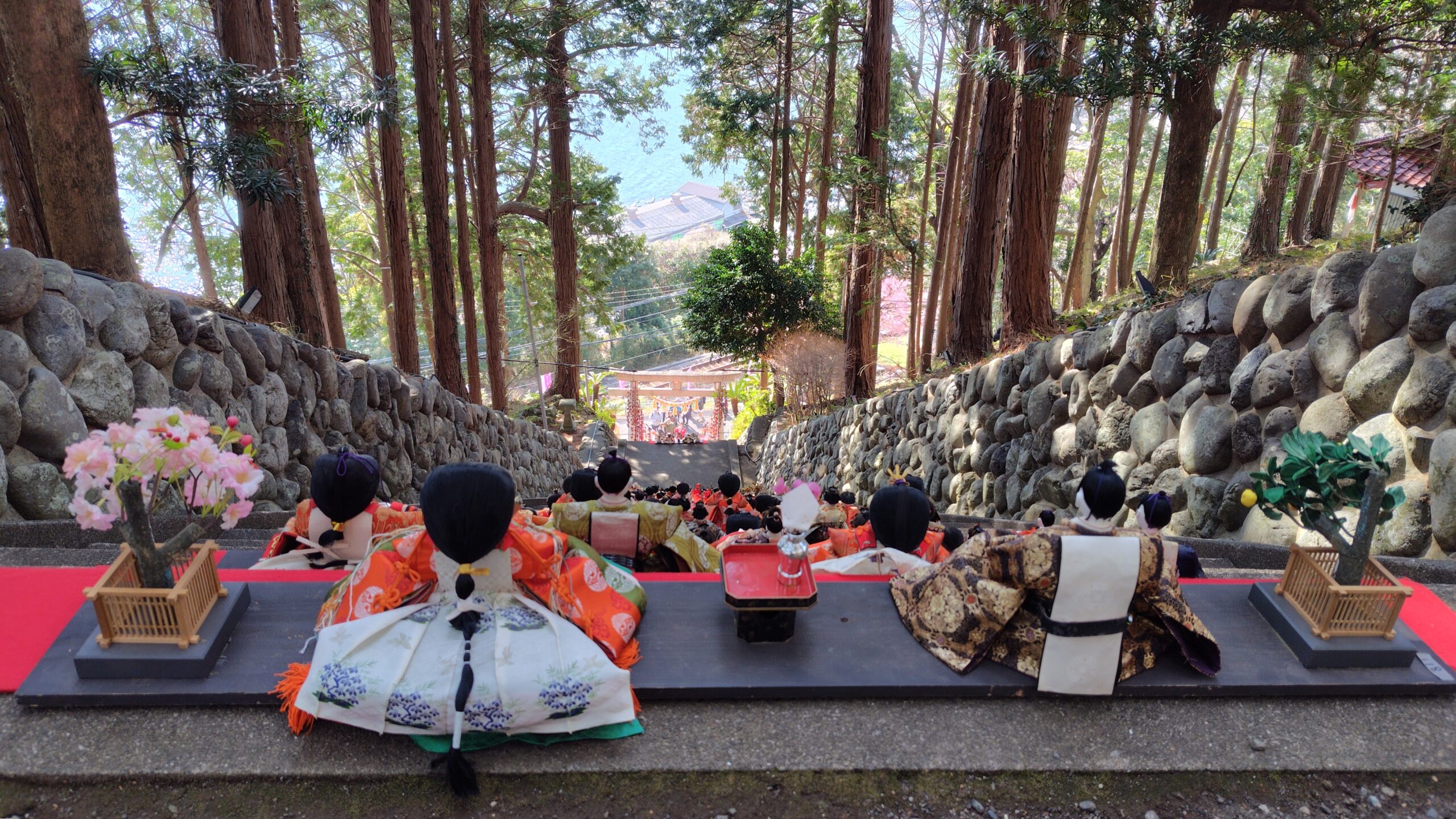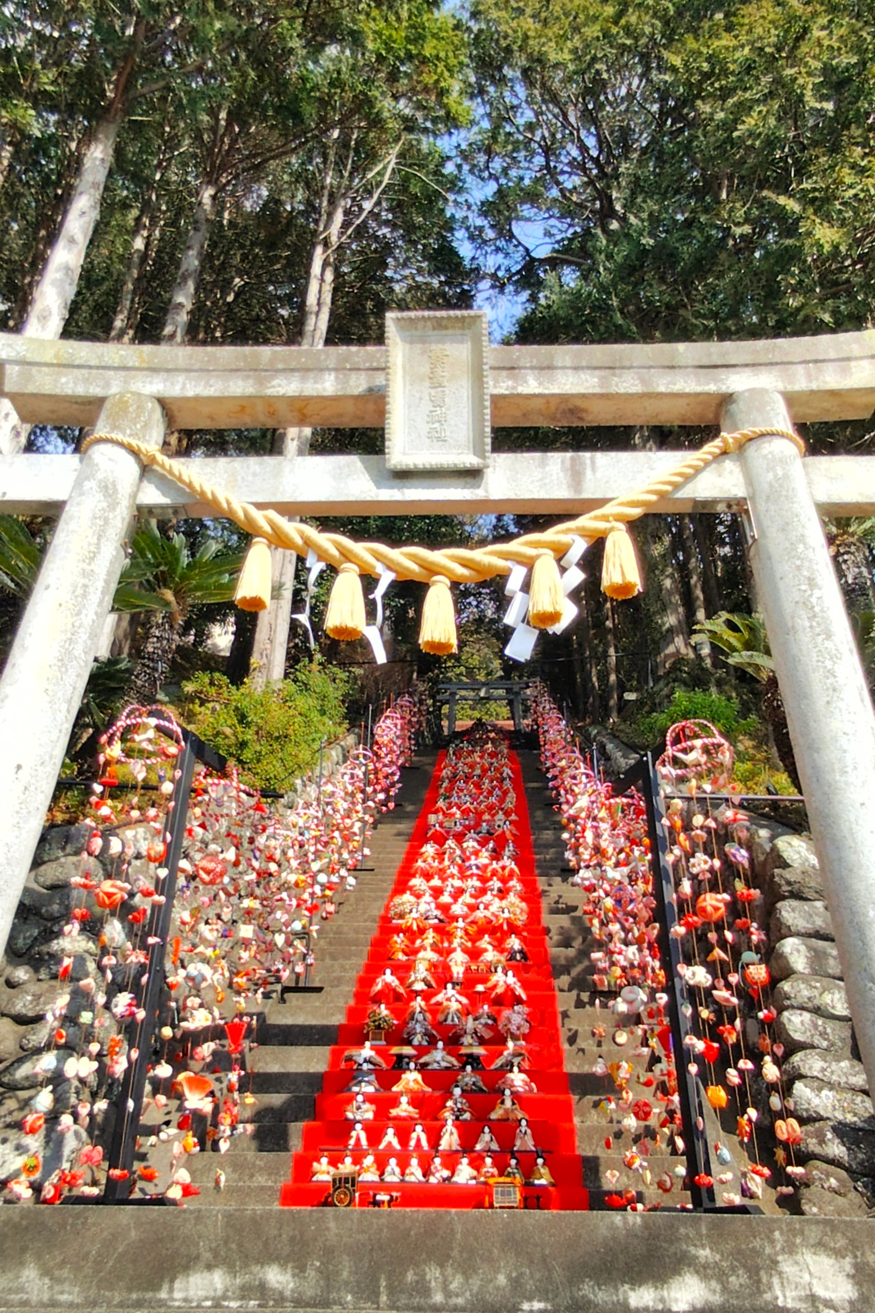 鳥居の奥の階段には華やかなひな人形が!こちらもとってもステキです🥰