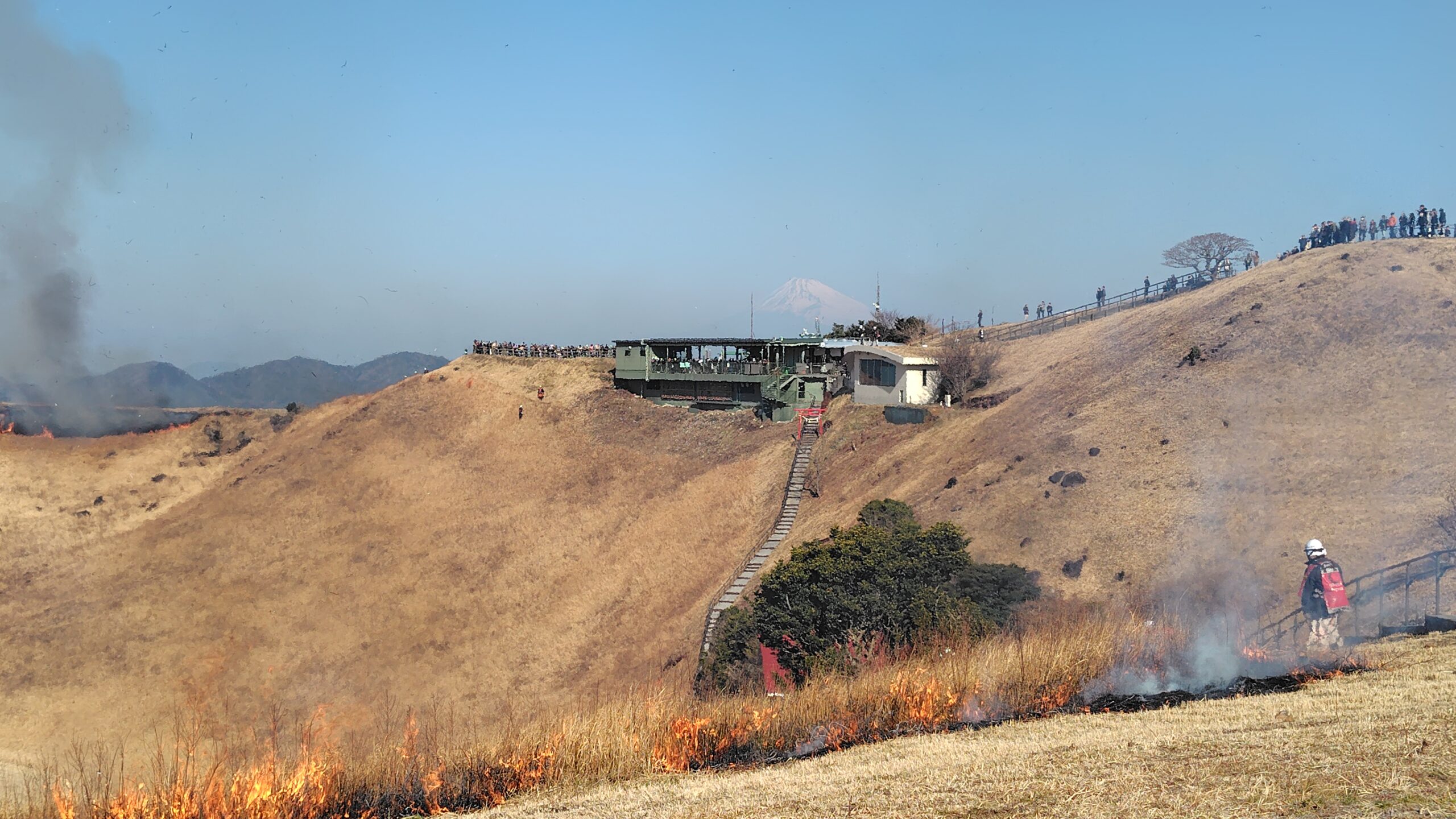 山焼きは2段階に分けて行われ、まずは山頂のお鉢部分を先に焼き、鎮火を確認してから全山焼きを始めます。これは、全山焼きの際に生き物たちが山頂部分に逃げ込めるようにするためだそうです🐭
