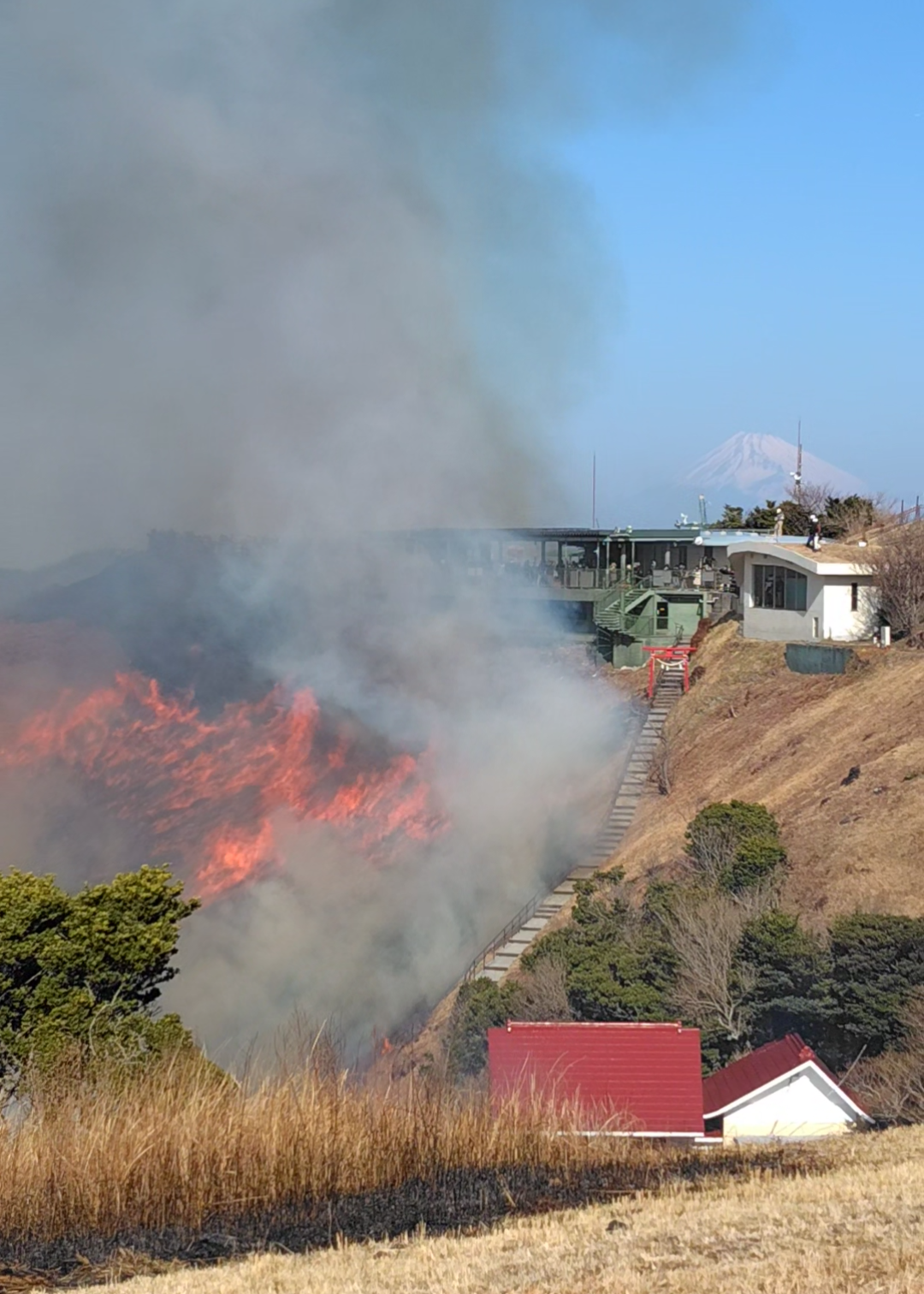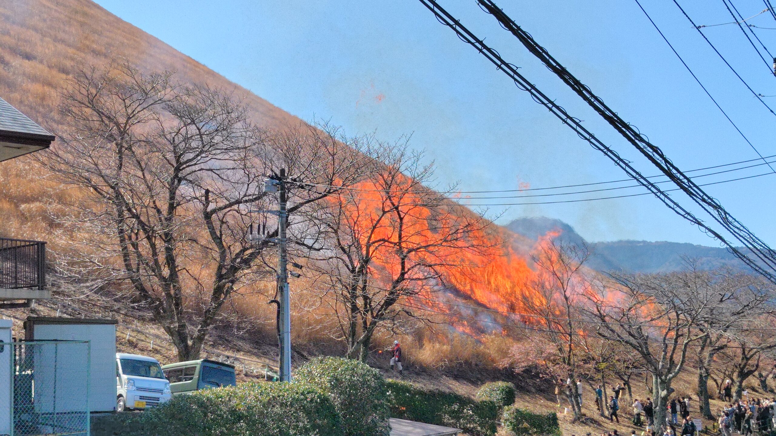 あっという間に山は炎で包まれました‼️なおリフトなど燃えてはいけないものの周辺は、あらかじめ茅を刈っておくことで延焼を防いでいるそうです。