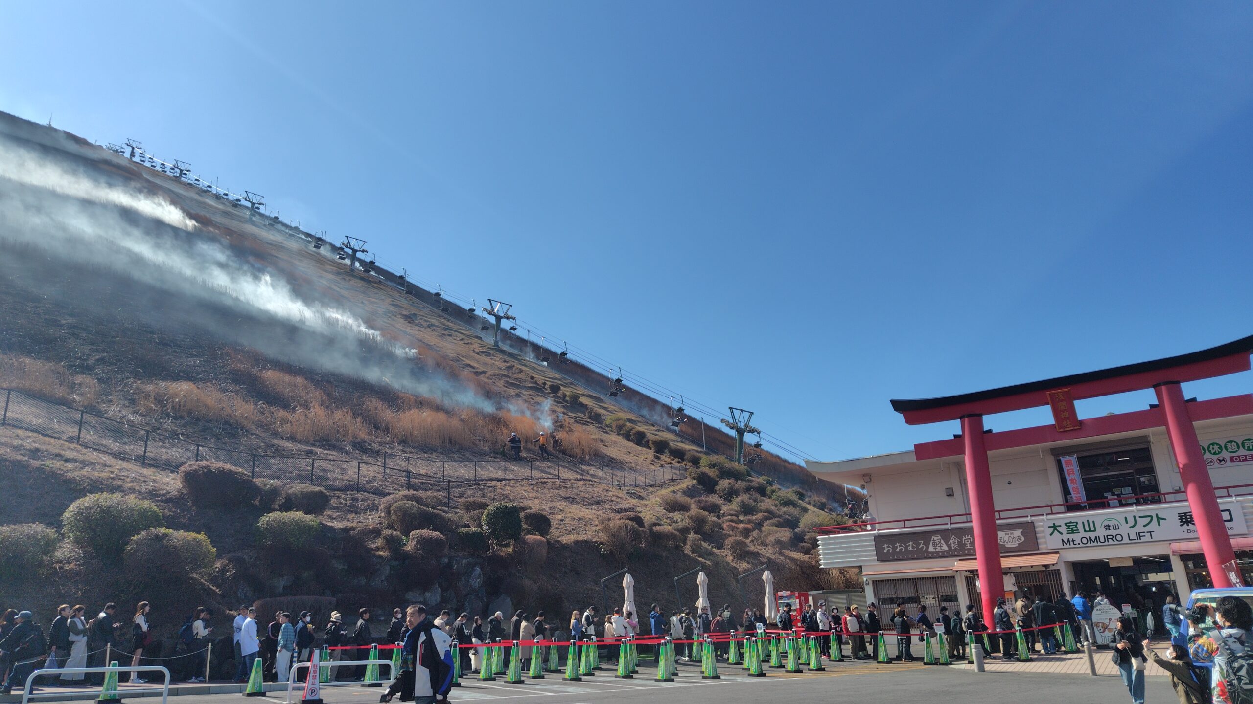 この後スタッフさんが鎮火を確認し、下山して全山焼きの準備が始まります。下りのリフトは大変混みますので、お鉢焼き見学は早めに切り上げて下山することをおすすめします。
